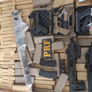 Um dos fuzis apreendidos é de calibre 762. O outro, calibre 556. Ambos têm alto poder destrutivo. Também foram apreendidos quatro kits rajada, acessório que transforma pistolas em armas automáticas, além de um pacote de haxixe.