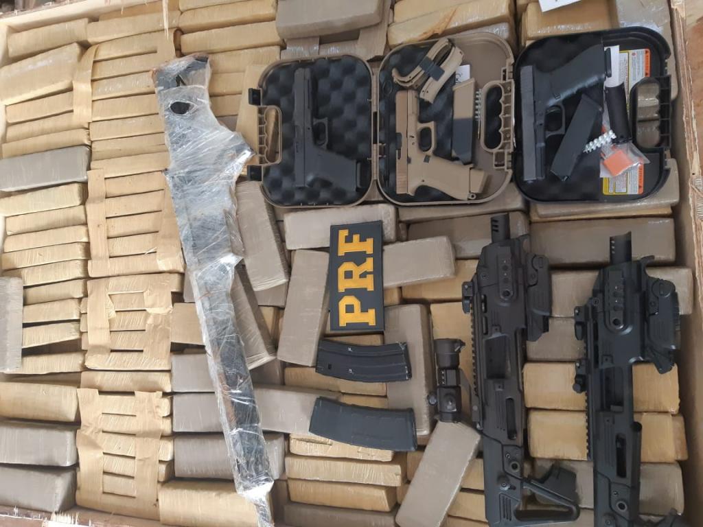 Equipes da Polícia Rodoviária Federal (PRF) e da Polícia Federal (PF) apreenderam dois fuzis, 14 pistolas, munições e toneladas de maconha acondicionadas em grandes caixas de madeira na manhã desta sexta-feira (17) em Palotina, na região oeste do Paraná.