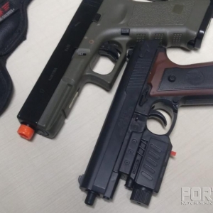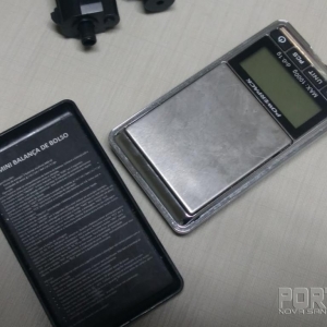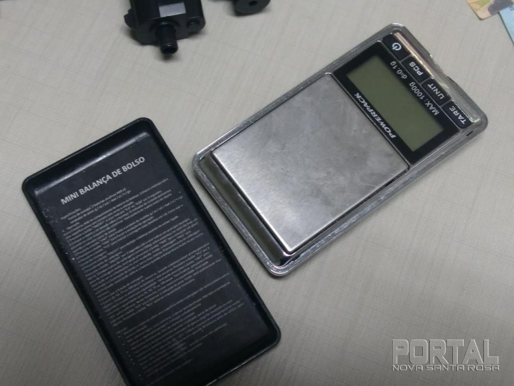 Que foi realizado buscas na residência onde foram encontrados no cômodo que servia de sala uma balança de precisão de marca powerpack de cor preta, uma bucha menor pronta para comercialização e uma maior que totalizaram nove gramas de substância análoga a cocaína. Na cozinha estavam dois capacetes e a motocicleta com alerta de furto/ roubo, Honda Twister, vermelha, motocicleta e capacetes estes usados no roubo da tarde, conforme vídeo que segue em anexo a este documento. Foram encontrados dois simulacros de arma de fogo, sendo uma réplica em “full metal” idêntica de pistola Glock a qual estava na sala e uma arma de brinquedo que estava no forro da residência.