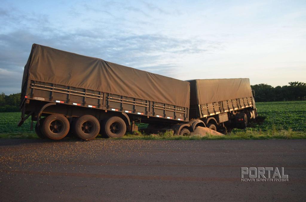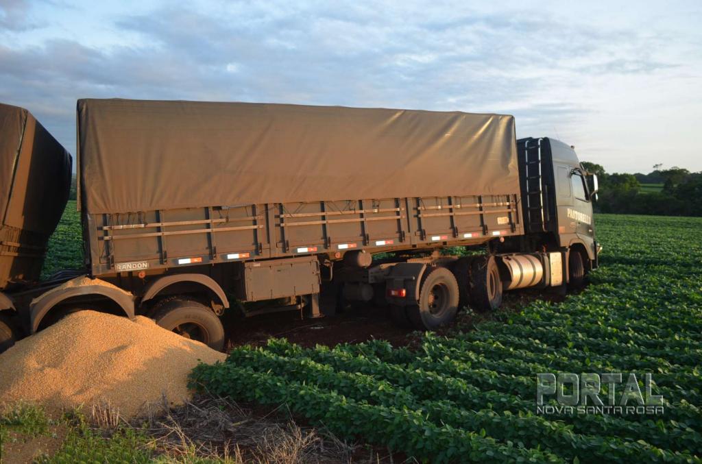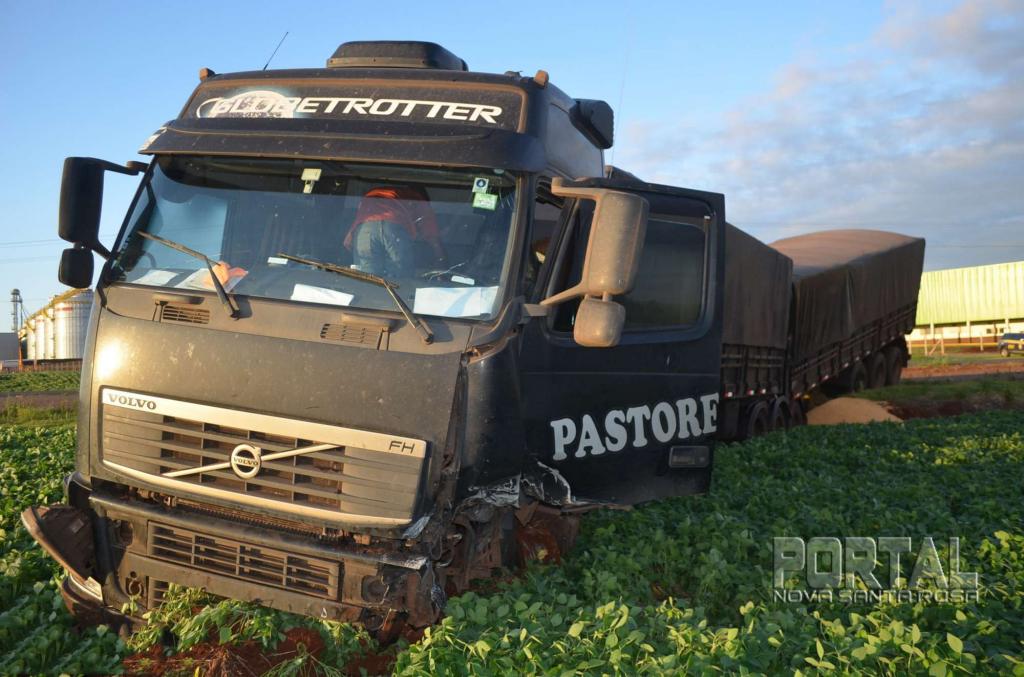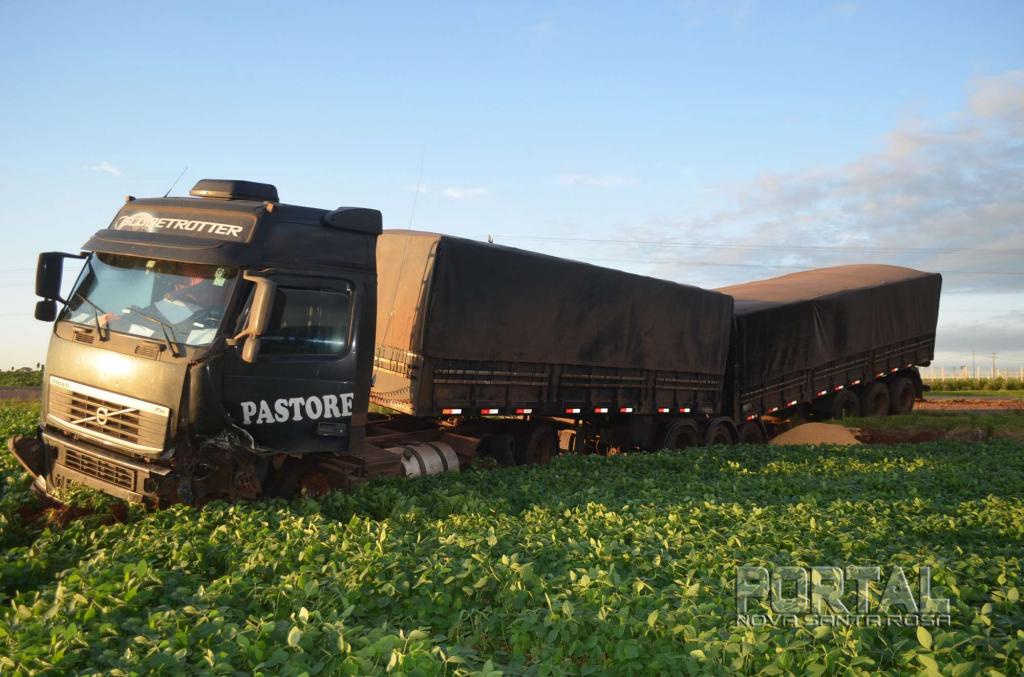 Depois da batida o motorista da carreta perdeu o controle, atravessou a BR e foi parar dentro de uma plantação de soja.