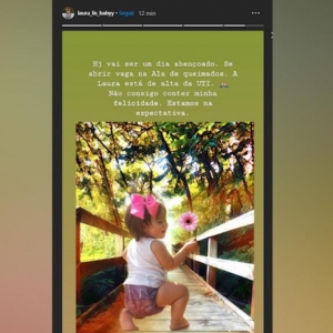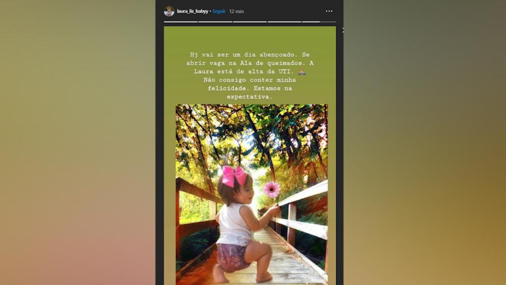 Ao fim, por meio das redes sociais, a mãe por mensagem reafirmou que aguarda leito na Ala de Queimados para a Laura Lis. "Hoje vai ser um dia abençoado. Se abrir vaga na Ala de Queimados, a Laura está de alta da UTI. Não consigo conter minha felicidade. Estamos na expectativa."