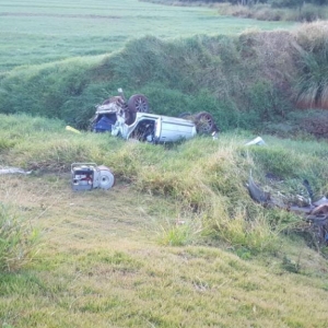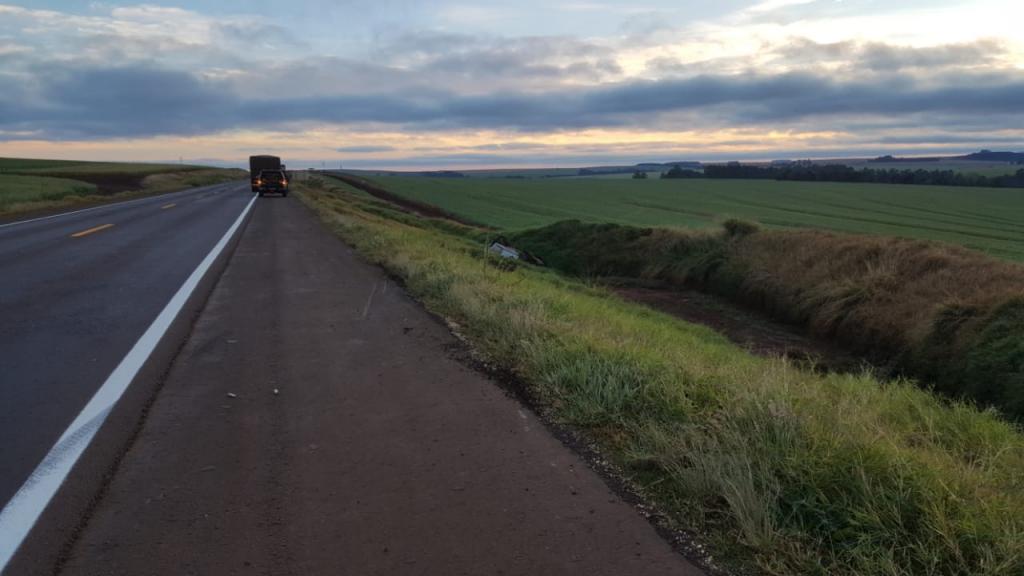 O automóvel saiu da pista, em um trecho reto, e foi parar às margens da BR com as rodas para cima. Não é possível afirmar as causas da saída de pista, seguida de capotamento.