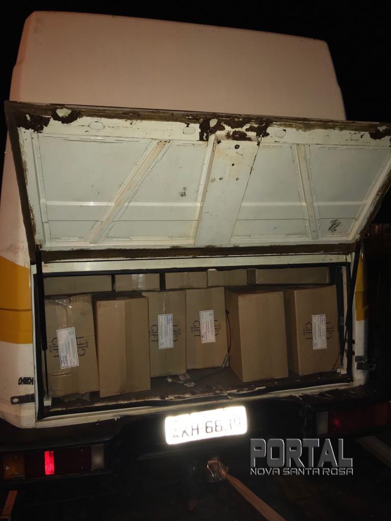 Um veículo Prisma que dava apoio à carga ilícita também foi apreendido. O preso foi encaminhado para a Polícia Federal e responderá pelos crimes de contrabando e direção perigosa.