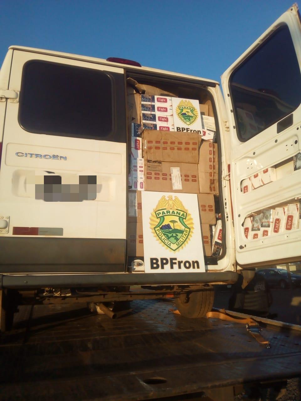 Ao realizar revista, foi constatado que o veículo estava completamente carregado com cerca de 140 caixas de cigarros contrabandeados do Paraguai.