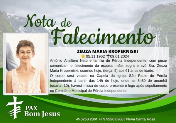 Antônio Ansiliero Neto e família de Pérola Independente, com pesar comunicam o falecimento da esposa, mãe, sogra e avó Sra. Zeuza Maria Kroperniski, ocorrido hoje, (terça, 9) aos 61 anos de idade.