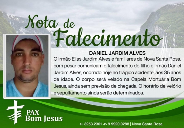O irmão Elias Jardim Alves e familiares de Nova Santa Rosa, com pesar comunicam o falecimento do filho e irmão Daniel Jardim Alves, ocorrido hoje no trágico acidente, aos 35 anos de idade.