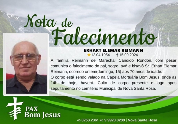A família Reimann de Marechal Cândido Rondon, com pesar comunica o falecimento do pai, sogro, avô e bisavô Sr. Erhart Elemar Reimann, ocorrido ontem (15) aos 70 anos de idade.