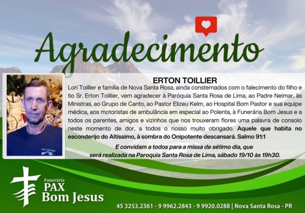 Lori Toillier e família de Nova Santa Rosa, ainda consternados com o falecimento do filho e tio Sr. Erton Toillier, vem agradecer à Paróquia Santa Rosa de Lima, ao Padre Neimar, às Ministras, ao Grupo de Canto, ao Pastor Elizeu Kelm, ao Hospital Bom Pastor e sua equipe médica, aos motoristas de ambulância em especial ao Polenta, à Funerária Bom Jesus e a todos os parentes, amigos e vizinhos que nos trouxeram flores uma palavra de consolo neste momento de dor, a todos o nosso muito obrigado. Aquele que habita no esconderijo do Altíssimo, à sombra do Onipotente descansará. Salmo 91:1