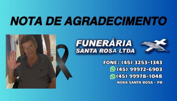 Ao Padre Neimar e Lucas, ao Grupo Litúrgico da Igreja Católica Santa Rosa de Lima, aos colaboradores da empresa Agrosil, a toda a equipe médica de Nova Santa Rosa e Toledo, a Funerária Santa Rosa, aos parentes, vizinhos e amigos, a todos que enviaram flores e coroas, aos que o visitaram sua enfermidade, um Deus lhes paguem.