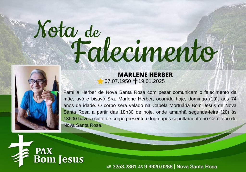 Família Herber de Nova Santa Rosa com pesar comunicam o falecimento da mãe, avó e bisavó Sra. Marlene Herber, ocorrido hoje, domingo (19), aos 74 anos de idade.