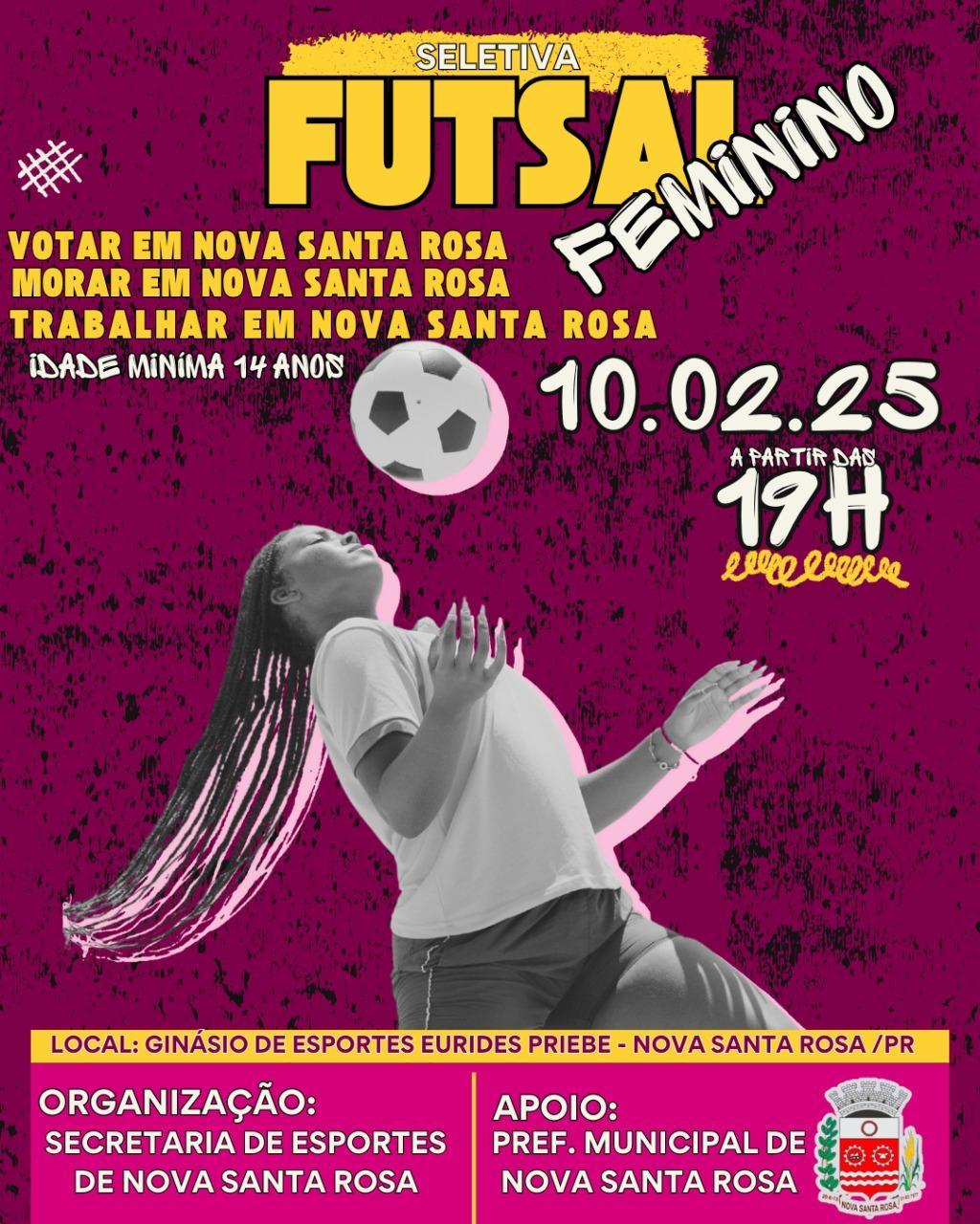 Está marcado para as 19h de hoje (10), no Ginásio de Esportes Eurides Priebe, a seletiva para a formação da Seleção de Futsal Feminino de Nova Santa Rosa. A ação está sendo organizada pela Secretaria de Esportes.