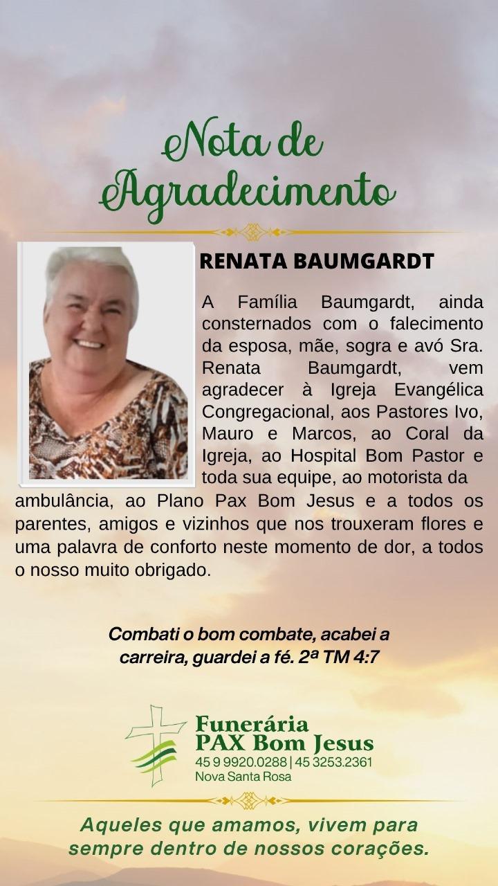 A Família Baumgardt, ainda consternada com o falecimento da esposa, mãe, sogra e avó Sra. Renata Baumgardt, vem agradecer à Igreja Evangélica Congregacional, aos Pastores Ivo, Mauro e Marcos, ao Coral da Igreja, ao Hospital Bom Pastor e toda sua equipe, ao motorista da ambulância, ao Plano Pax Bom Jesus, e a todos os parentes, amigos e vizinhos que trouxeram flores e uma palavra de conforto neste momento de dor. A todos o nosso muito obrigado.