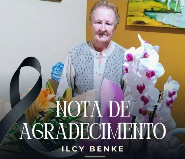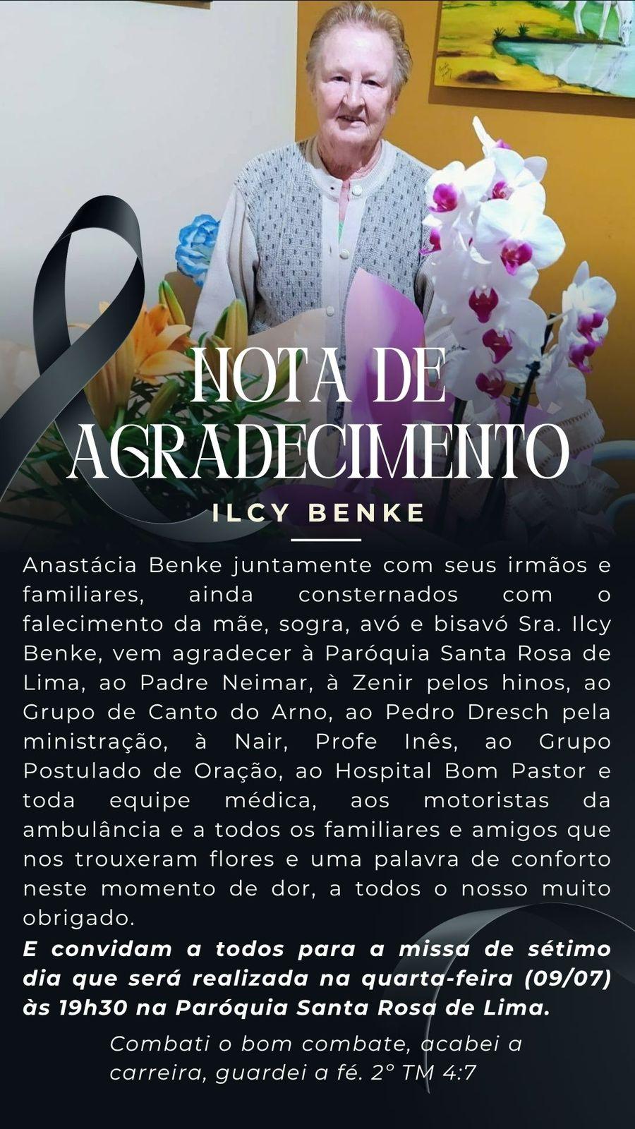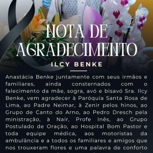 Anastácia Benke juntamente com seus irmãos e familiares, ainda consternados com o falecimento da mãe, sogra, avó e bisavó Sra. Ilcy Benke, vem agradecer à Paróquia Santa Rosa de Lima, ao Padre Neimar, à Zenir pelos hinos, ao Grupo de Canto do Arno, ao Pedro Dresch pela ministração, à Nair, Profe Inês, ao Grupo Postulado de Oração, ao Hospital Bom Pastor e toda equipe médica, aos motoristas da ambulância e a todos os familiares e amigos que nos trouxeram flores e uma palavra de conforto neste momento de dor, a todos o nosso muito obrigado.