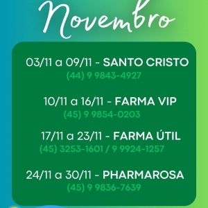 - 03/11 a 09/11: Farmácia Santo Cristo - (44) 9 9843-4927;