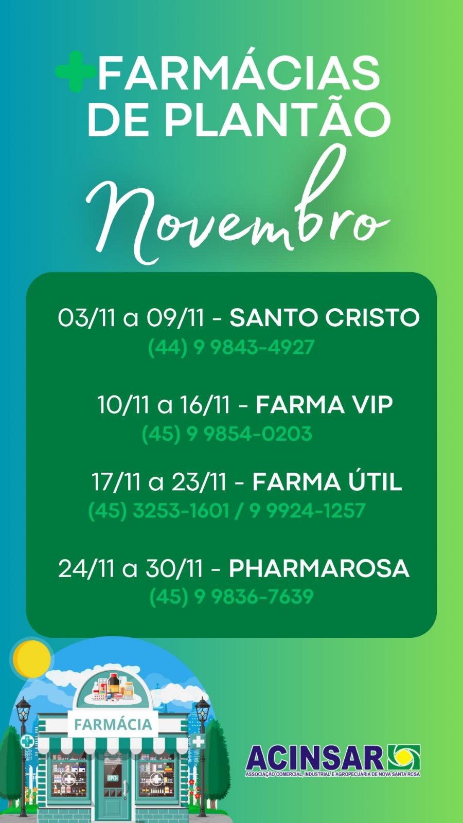 Confira o Plantão das Farmácias, e os seus respectivos telefones para contato, durante o mês de novembro/2025 em Nova Santa Rosa: