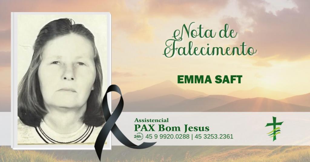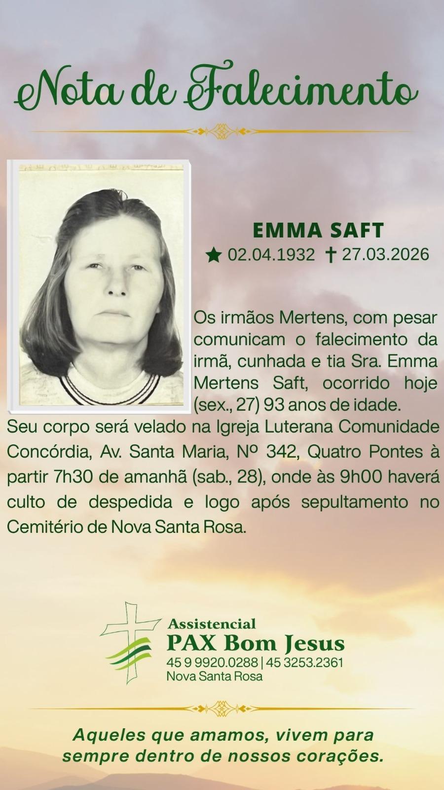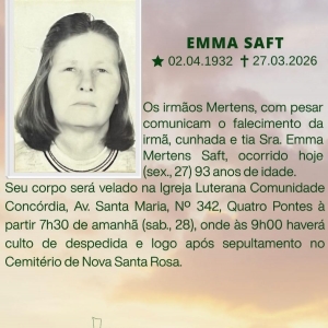 Os irmãos Mertens, com pesar comunicam o falecimento da irmã, cunhada e tia Sra. Emma Mertens Saft, ocorrido hoje (sex., 27) 93 anos de idade.