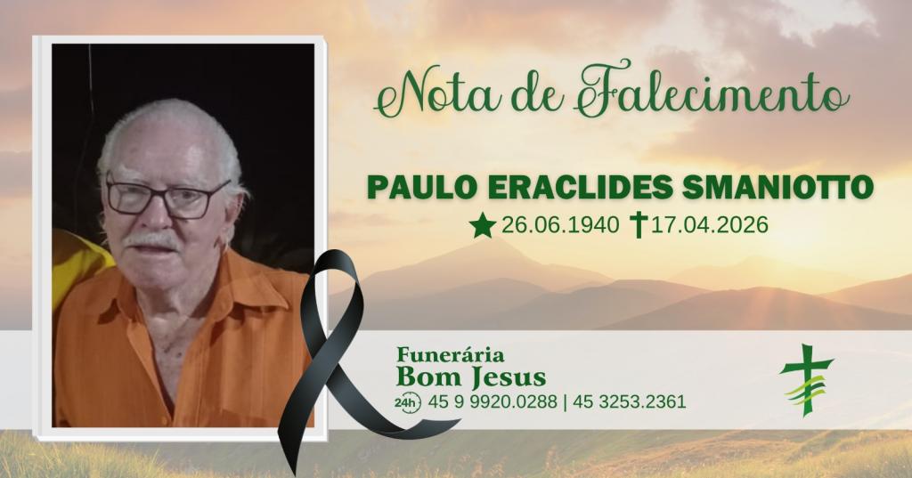 A esposa Nadir Meneghini Smaniotto, juntamente com os filhos, noras, netos e bisnetos, com pesar comunica o falecimento do esposo, pai, avô e bisavô Sr. Paulo Eraclides Smaniotto, ocorrido hoje (sex., 17) aos 85 anos de idade.