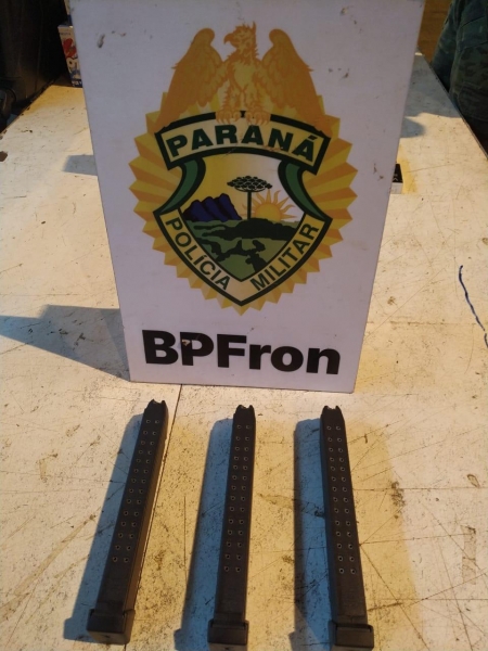 Durante busca no ônibus foi localizado na lixeira do banheiro, 3 carregadores de pistola da marca Glock cal. 9mm com capacidade para 30 munições.