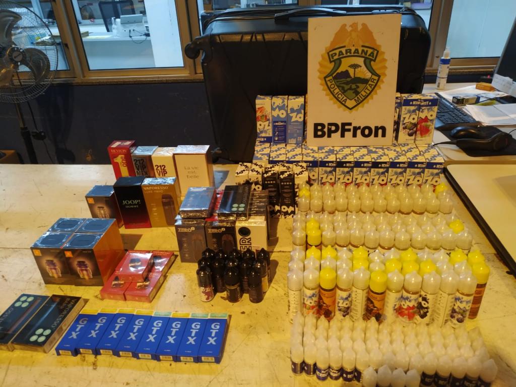 Na segunda-feira (08), policiais militares do BPFRON - Batalhão de Polícia de Fronteira, realizavam patrulhamento pela cidade de Medianeira, durante Operação Hórus, quando realizaram abordagem a um ônibus com itinerário até a cidade Londrina-PR, em revista a um passageiro foram localizados em sua bagagem diversos produtos de origem estrangeira (cigarros eletrônicos, essências e acessórios para cigarros eletrônicos).