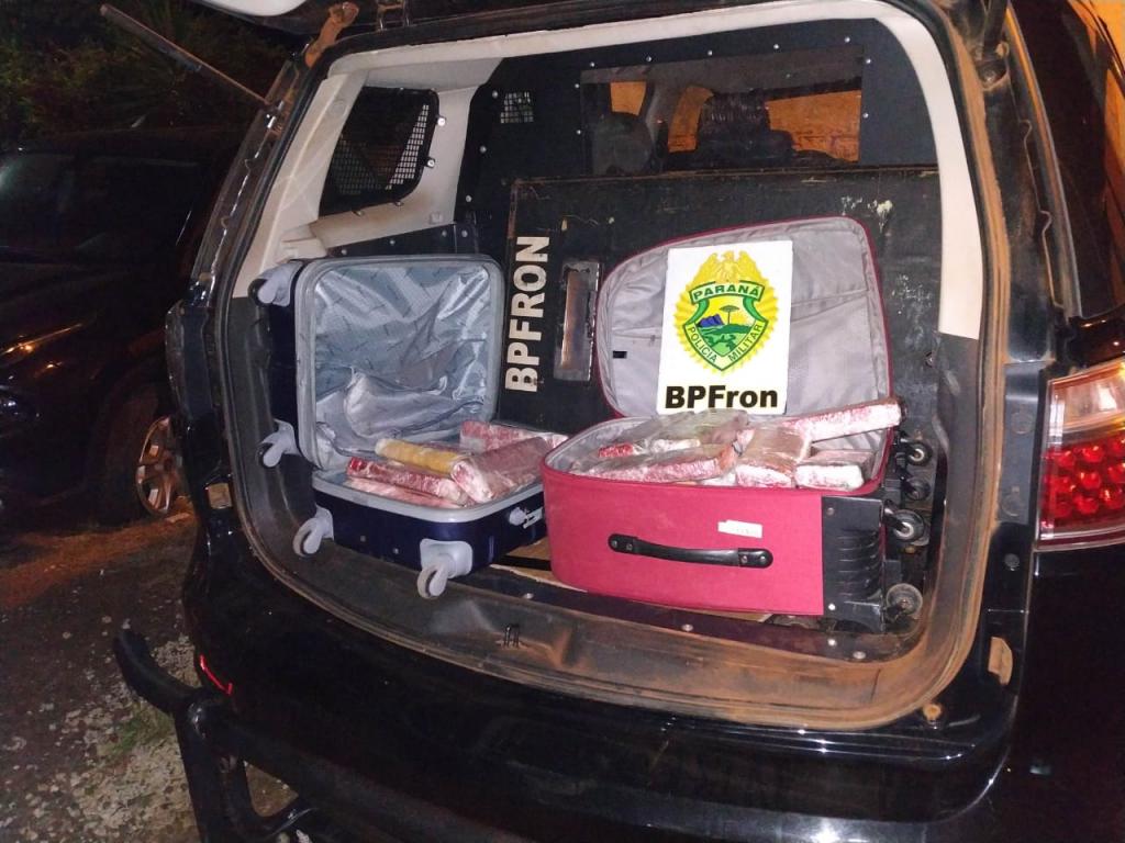 Na noite desta terça-feira (08), no âmbito da Operação Hórus do programa VIGIA, com apoio do SEOPI/MJ Policiais Militares do BPFRON – Batalhão de Polícia de Fronteira realizaram abordagem a um ônibus que fazia linha Foz do Iguaçu a Curitiba e durante as buscas no bagageiro foram encontradas duas malas contendo vários tabletes de substância análoga a maconha.