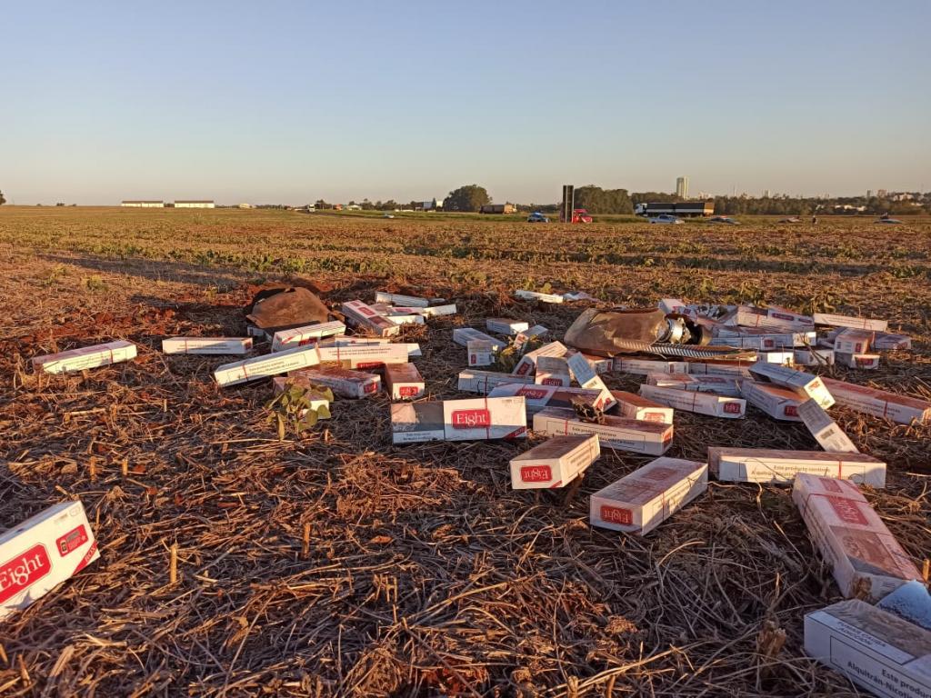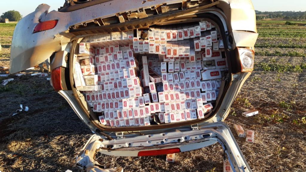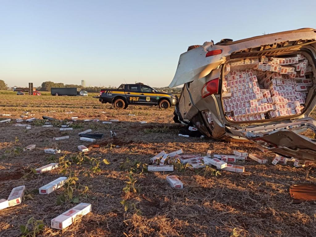 A Policia Rodoviária Federal apreendeu, na tarde de hoje (29) 22.500 maços de cigarros contrabandeados transportados em uma Santa Fé roubada. O condutor desobedeceu a tentativa de abordagem na BR 467, em Toledo, e empreendeu fuga em alta velocidade.