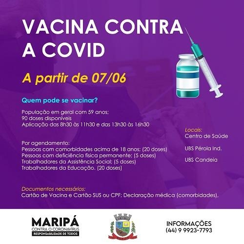 A aplicação está sendo realizada diariamente das 8h30 às 11h30 e das 13h30 às 16h30 no Centro de Saúde de Maripá e nas Unidades Básicas de Saúde dos distritos de Candeia e Pérola Independente. É necessário apresentar a Carteira de Vacinação e o CPF ou Cartão SUS, além da declaração médica comprovando comorbidade, no caso deste público-alvo específico.