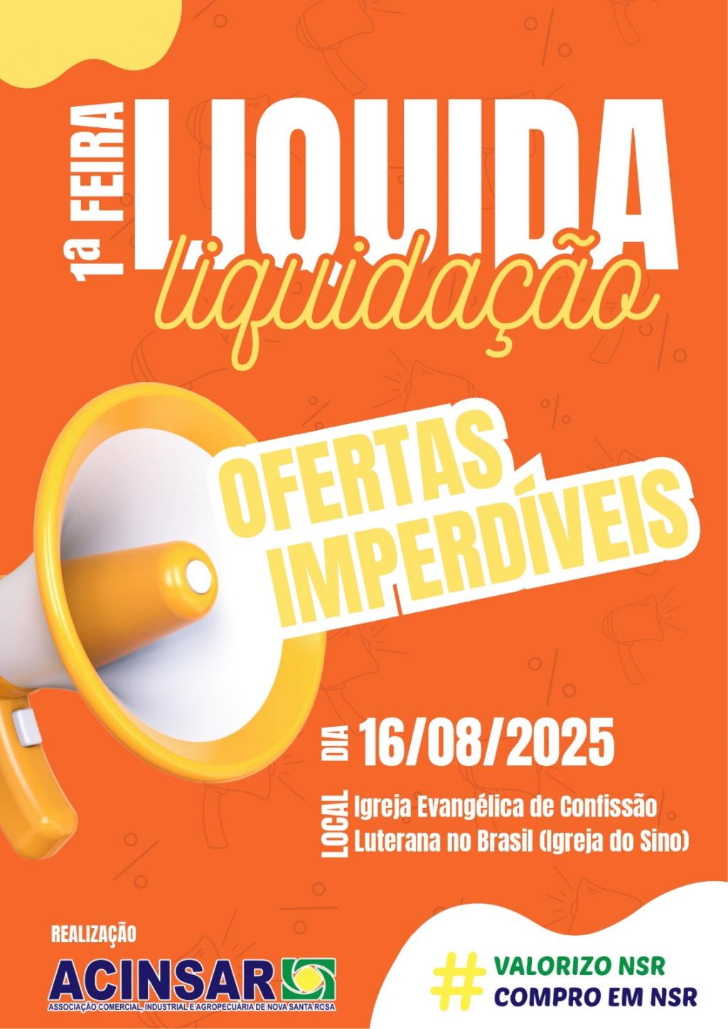 Neste sábado (16), acontece em Nova Santa Rosa a 1ª edição da Feira Liquida Liquidação, promovida pela Associação Comercial, Industrial e Agropecuária de Nova Santa Rosa (Acinsar). O evento será realizado na Igreja Evangélica de Confissão Luterana no Brasil, conhecida como Igreja do Sino, e estará aberto ao público das 10h às 18h.