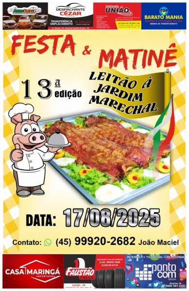 Está confirmada para o dia 17 de agosto de 2025 a realização da 13ª Festa e Matinê do Leitão à Jardim Marechal, um dos eventos mais tradicionais e saborosos da região. A celebração promete reunir famílias e visitantes em um domingo especial, com gastronomia típica e ambiente acolhedor.