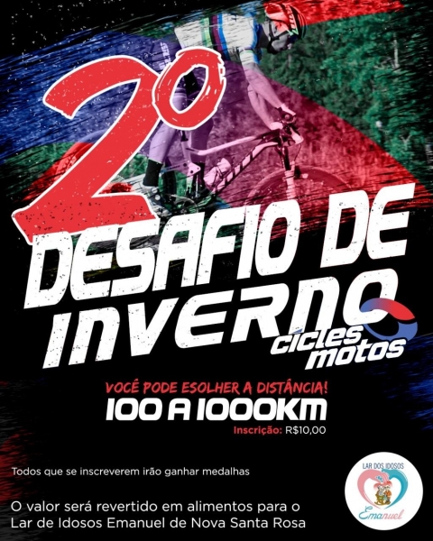 Para se inscrever, você ciclista pagará apenas R$ 10 pela taxa de inscrição, valor este, que será revertido em alimentos para o Lar de Idosos Emanuel de Nova Santa Rosa.
