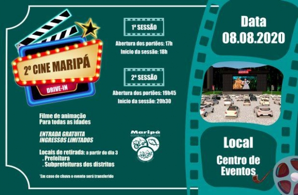 O segundo cinema em formato drive-in de Maripá já tem data definida. O evento será realizado no dia 8 de agosto, no Centro de Eventos. Serão duas sessões com a exibição de um filme de animação destinado para todas as idades, a primeira com início às 18h e a segunda às 20h30.