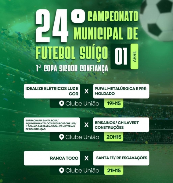 Hoje, quarta-feira (01) tem a sétima rodada do 24º Campeonato Municipal de Futebol Suíço – 1ª Copa Sicoob Confiança. Os jogos serão realizados no Clube União, com três partidas programadas para a noite.