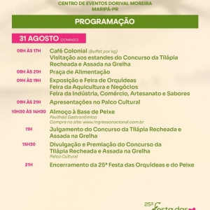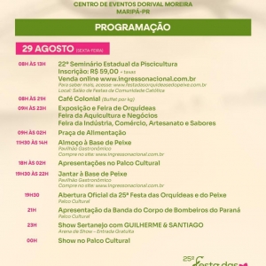 Com uma programação diversificada, o evento é ideal para quem busca novidades nas áreas de aquicultura e orquidicultura, além de boa gastronomia, cultura, música e lazer para todas as idades.