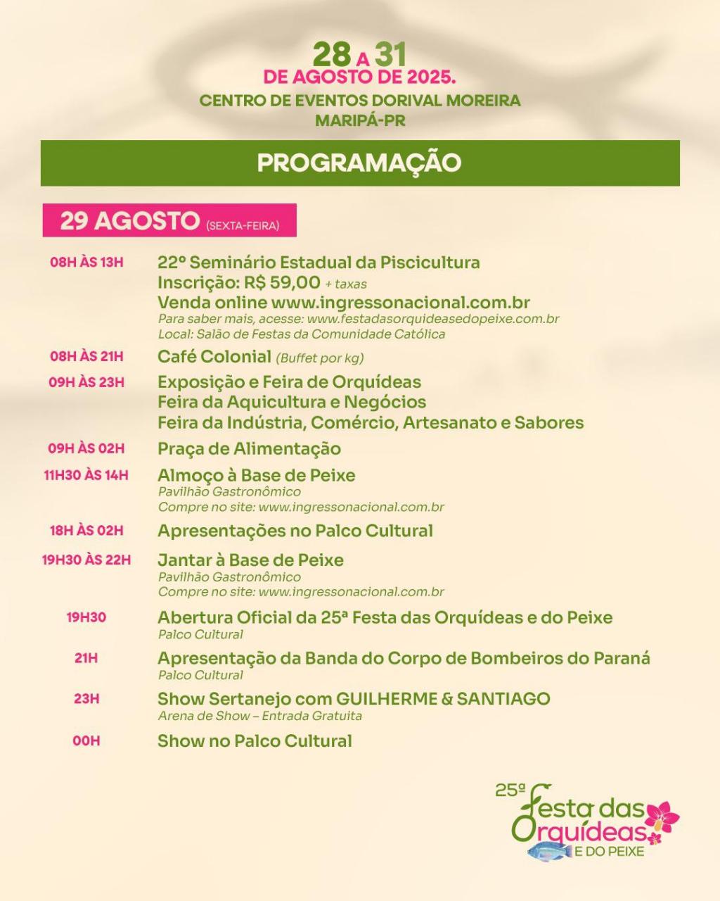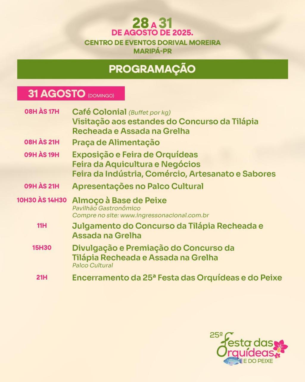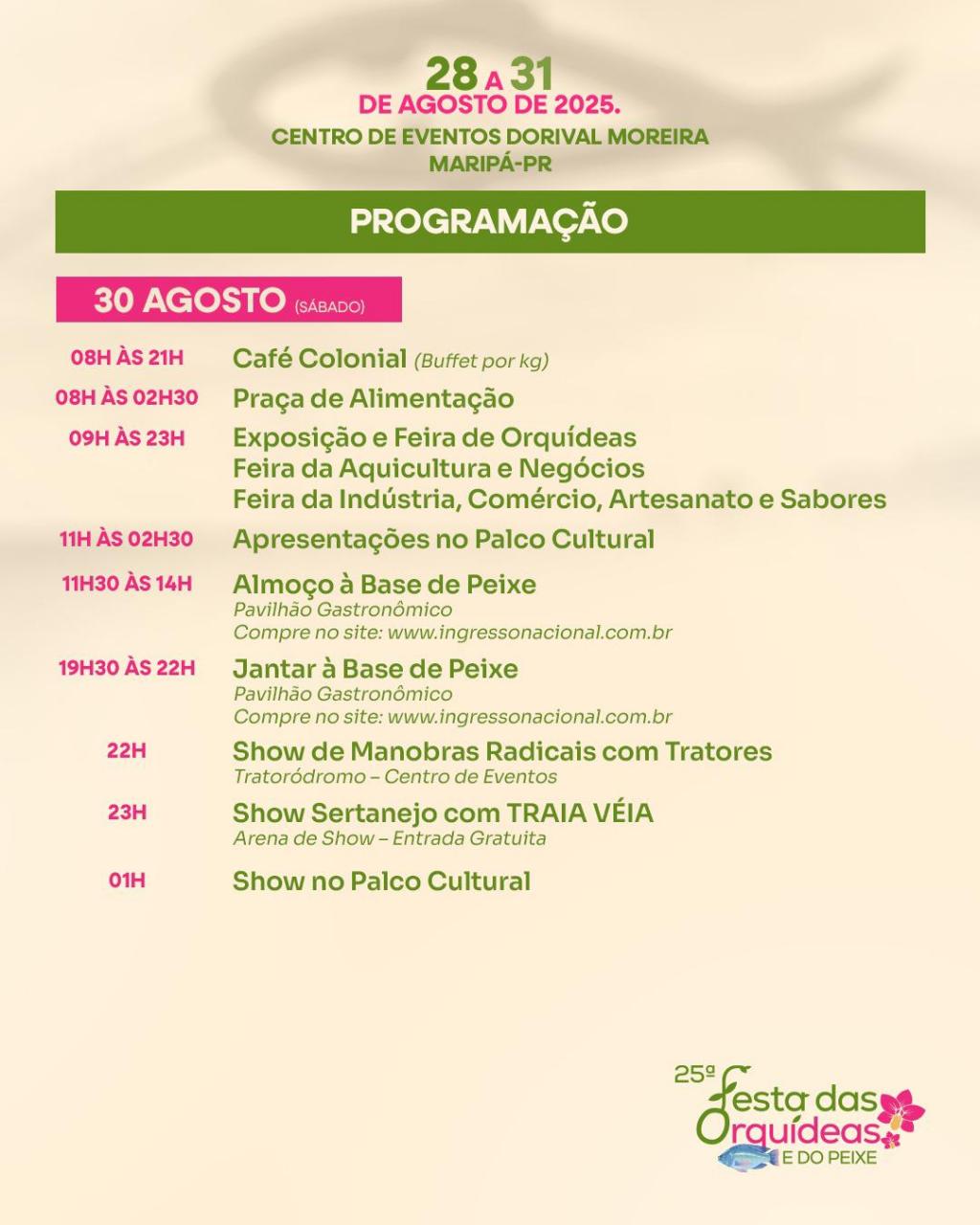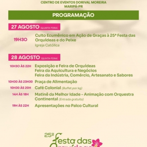 A cidade de Maripá se prepara para receber uma das festas mais tradicionais e aguardadas da região: a 25ª Festa das Orquídeas e do Peixe, que acontece de 28 a 31 de agosto no Centro de Eventos Dorival Moreira.
