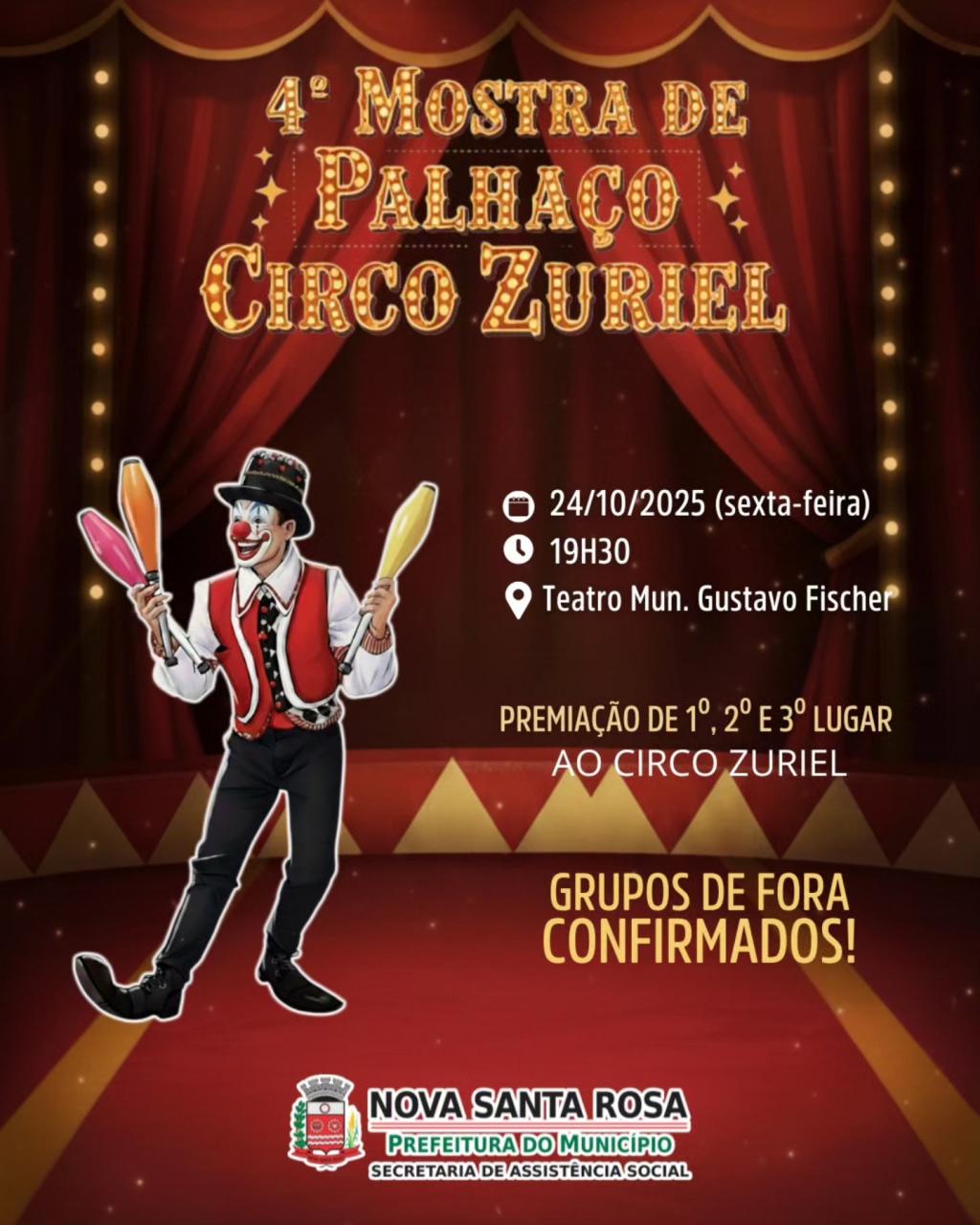 A Prefeitura de Nova Santa Rosa, por meio da Secretaria de Assistência Social e do Projeto Viver, em parceria com o Circo Zuriel, realiza nesta sexta-feira (24), a 4ª Mostra de Palhaço Circo Zuriel. O evento será no Teatro Municipal Gustavo Fischer, com início às 19h30.