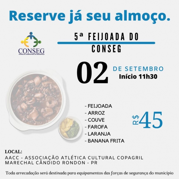 Será realizada a 5º edição da Feijoada do CONSEG – Conselho Comunitário de Segurança de Marechal Rondon.