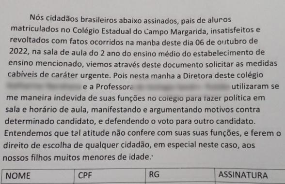 Um abaixo assinado foi organizado por pais de alunos do Colégio Estadual do Campo Margarida, distrito de Marechal Cândido Rondon, que denunciam manifestações políticas dentro da sala de aula do 2º ano do Ensino Médio.