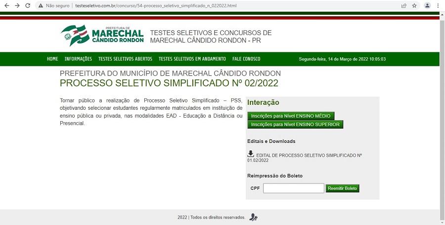 Estão abertas a partir desta segunda-feira (14), as inscrições ao Processo Seletivo Simplificado (PSS) nº 02/2022, da Secretaria de Educação de Marechal Cândido Rondon.