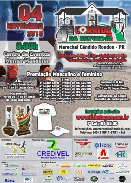 Estão abertas as inscrições para a 4ª Corrida da Reforma, a prova ocorrerá no dia 04 de novembro de 2018 no centro de eventos de Marechal Cândido Rondon, com a realização da Associação dos Corredores de Marechal Cândido Rondon, AcorreRondon, e o apoio da Secretaria de Esporte e Lazer, SESC, ACIMACAR, Igreja Evangélica Luterana do Brasil e Igreja Evangélica de Confissão Luterana no Brasil.