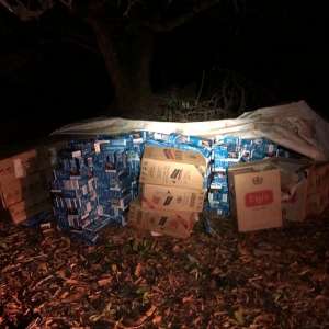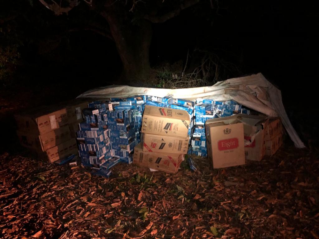Ao realizar buscas nas localidades, as equipes policiais localizaram dois depósitos de cigarros contrabandeados em propriedades rurais das proximidades.