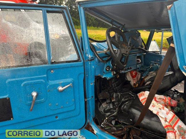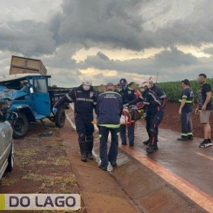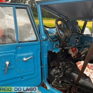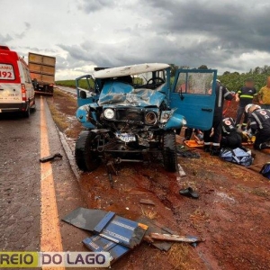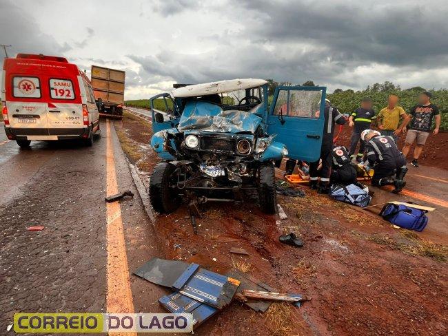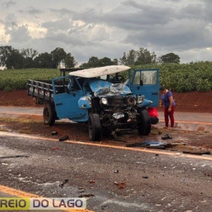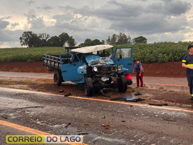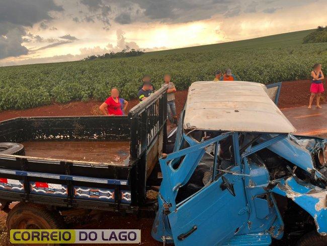Um acidente gravíssimo aconteceu na tarde desta segunda-feira (1º) na PR-495, no distrito de Moreninha, em Santa Helena, região da Lagoa Seca. A colisão frontal envolveu um caminhão de transporte de suínos e uma caminhonete Toyota Bandeirante, modelo antigo.