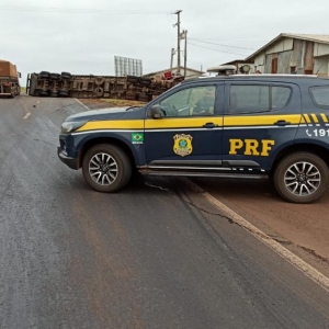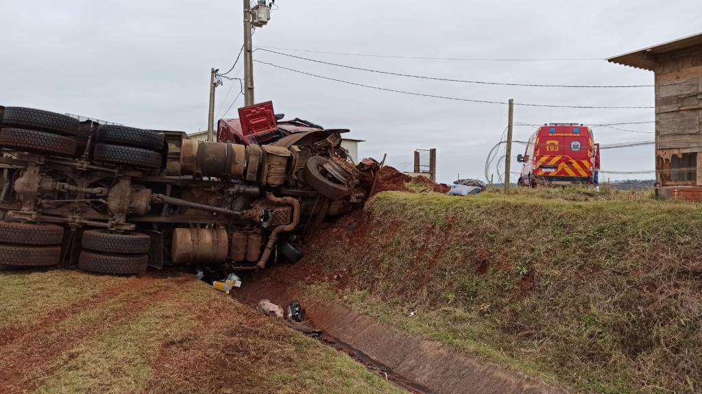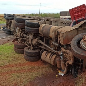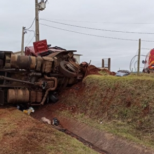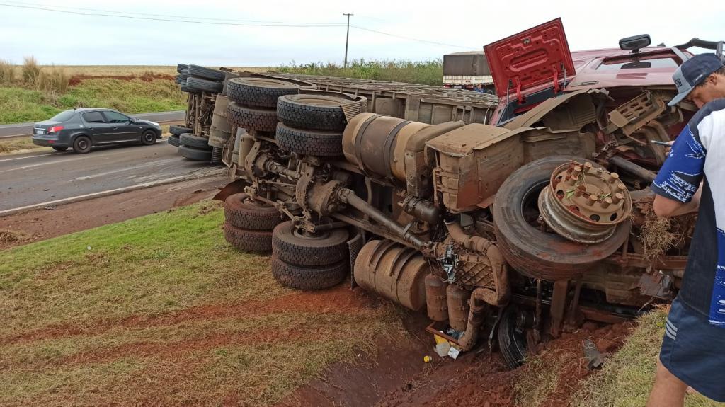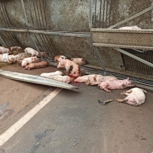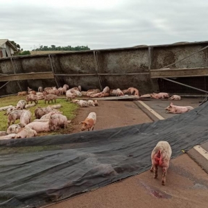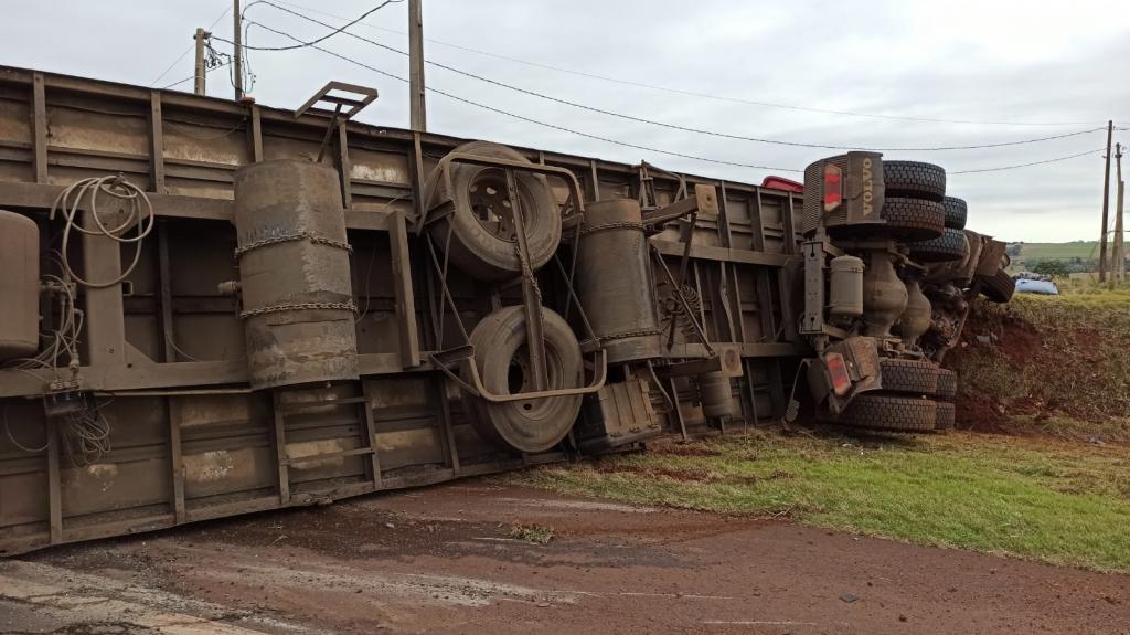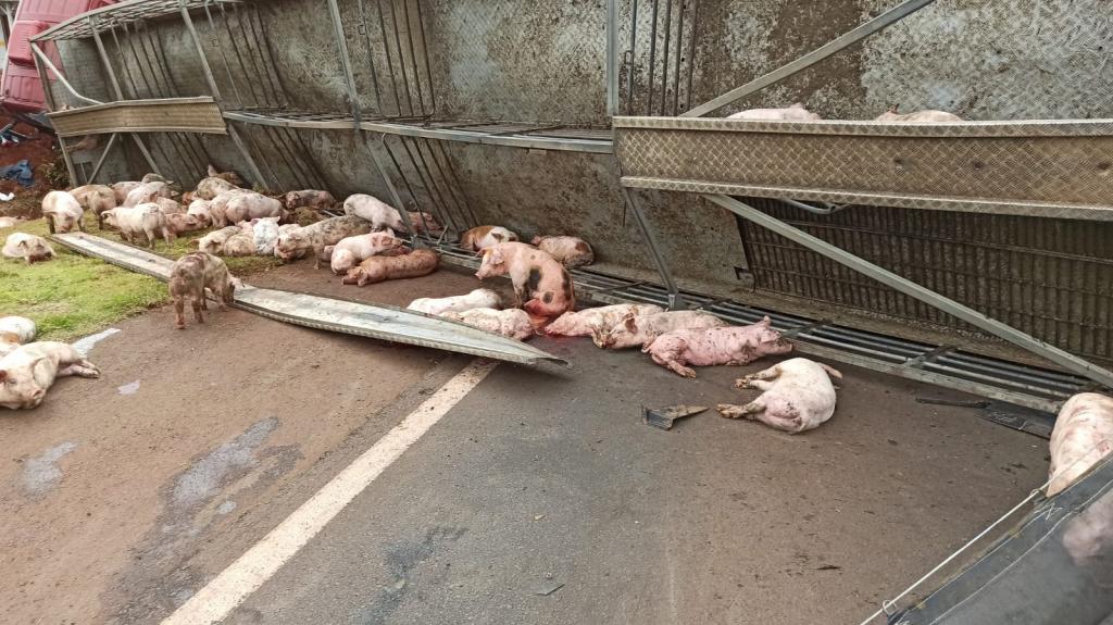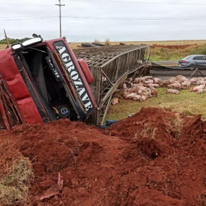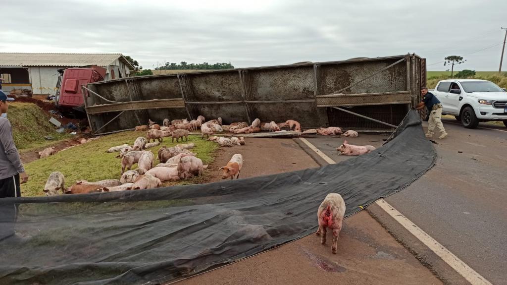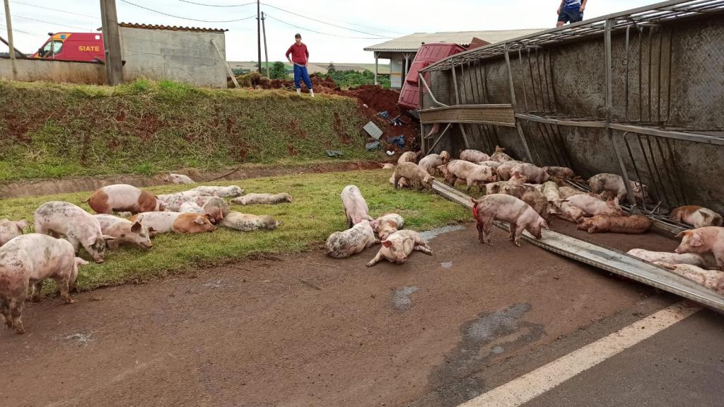Após, o motorista perdeu o controle da direção e bateu contra um barranco e tombou interditando parcialmente a pista no sentido a Marechal Cândido Rondon deixando a carga de suínos espalhada pela rodovia com vários animais mortos e outros feridos.