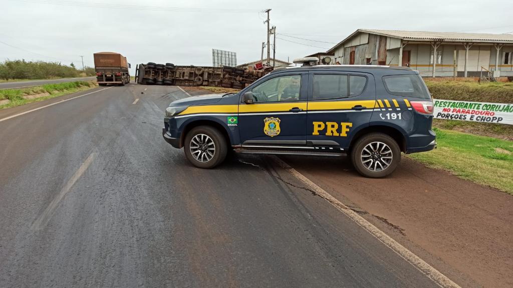 Uma colisão seguida de tombamento aconteceu no início da manhã deste sábado na rodovia BR 163 que liga Toledo ao município de Marechal Cândido Rondon próximo ao distrito de Vila Ipiranga em Toledo e envolveu uma carreta Scania bitrem como placas Mercosul e uma outra carreta carregada com leitões.