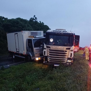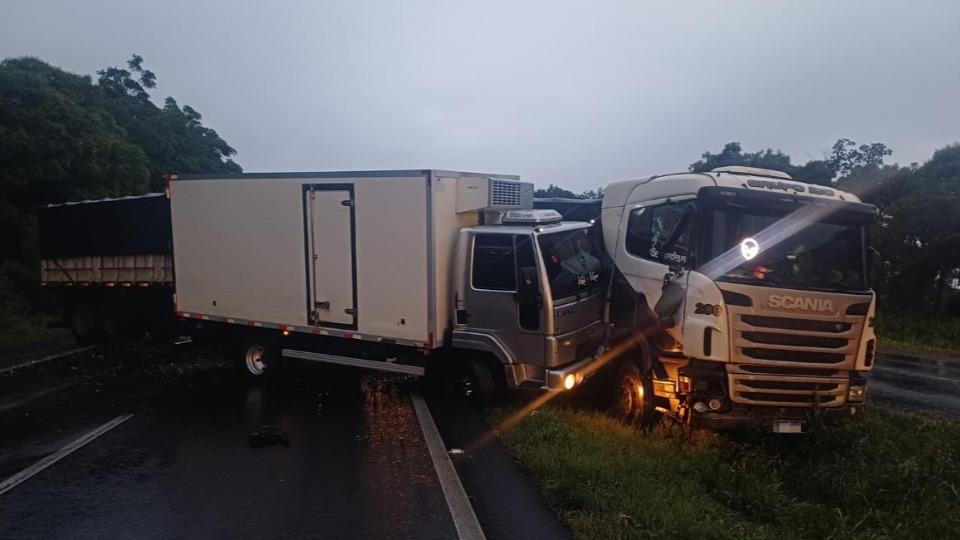 A Polícia Rodoviária Federal (PRF) informou que o condutor de um Ford Cargo, de 48 anos, perdeu o controle da direção e acabou rodando sobre a pista. Logo atrás seguia um bitrem Scania, dirigido por um jovem de 26 anos, que não conseguiu desviar e atingiu o Ford transversalmente. Após o impacto, os dois veículos ficaram imobilizados entre a faixa da esquerda e o canteiro central, provocando bloqueio parcial da rodovia.