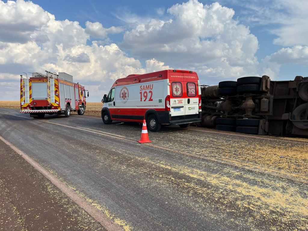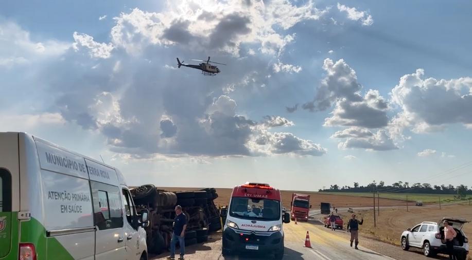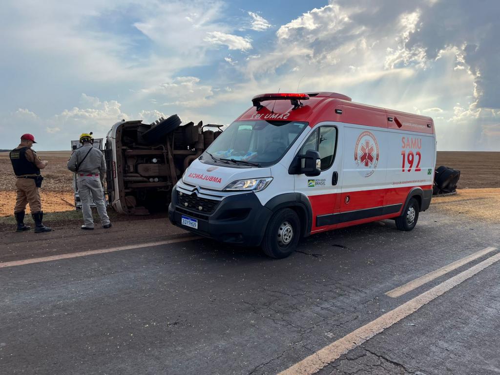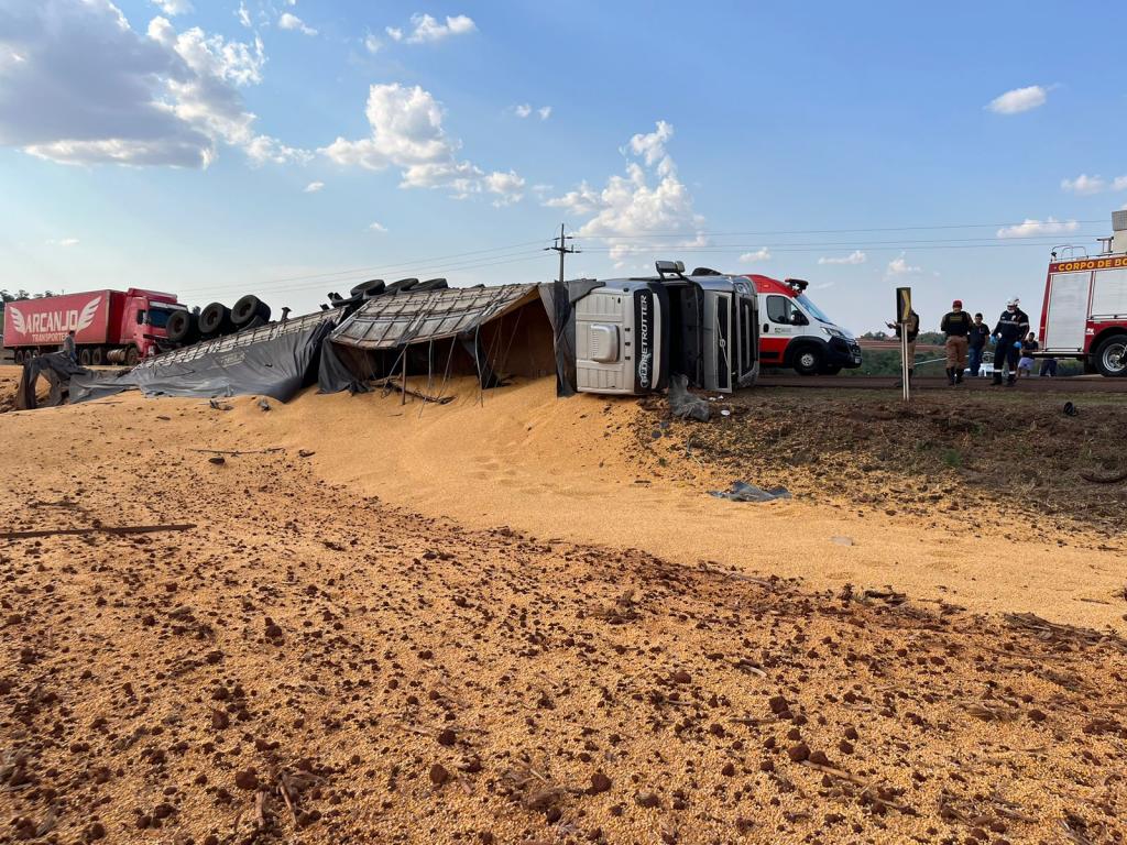 O condutor seguia no sentido Maripá a Toledo, e ao final da curva o veículo acabou tombando deixando a carga espalhada na rodovia e fora dela.