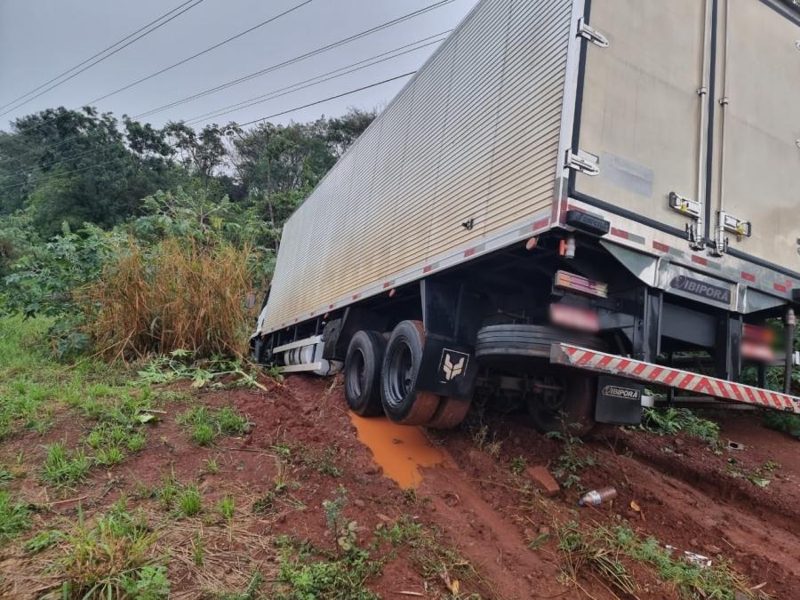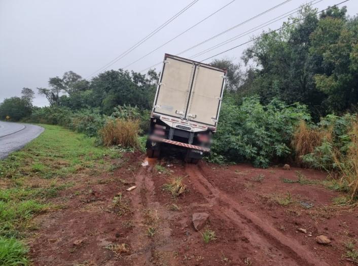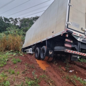A saída de pista aconteceu um uma curva. O Cargo 2429 com placa de Espigão D’Oeste-RO ficou com a parte da cabine em local de difícil acesso.