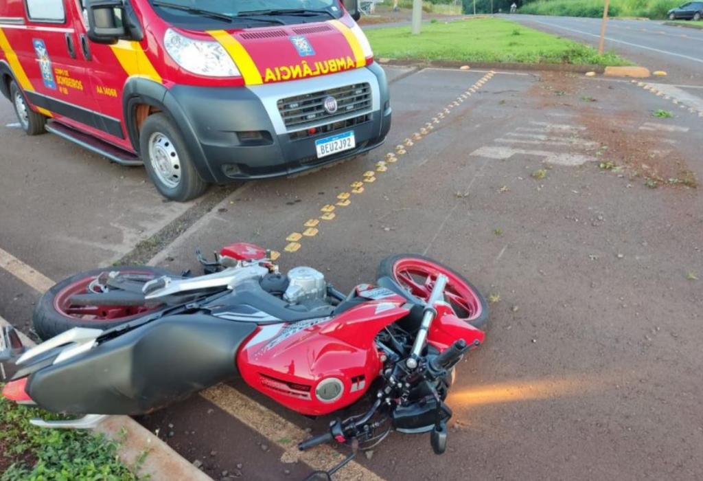 O Corpo de Bombeiros foi acionado para socorrer a condutora de uma motocicleta Twister de cor vermelha com placa Brasil, que teve escoriações nos braços e pernas e uma contusão no pé.