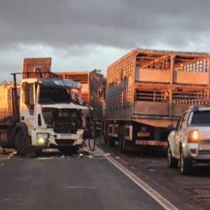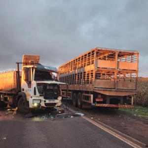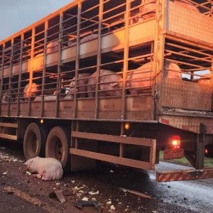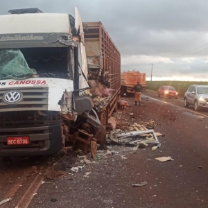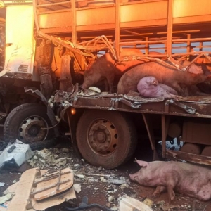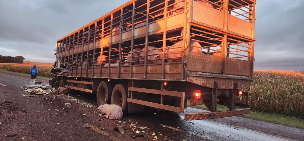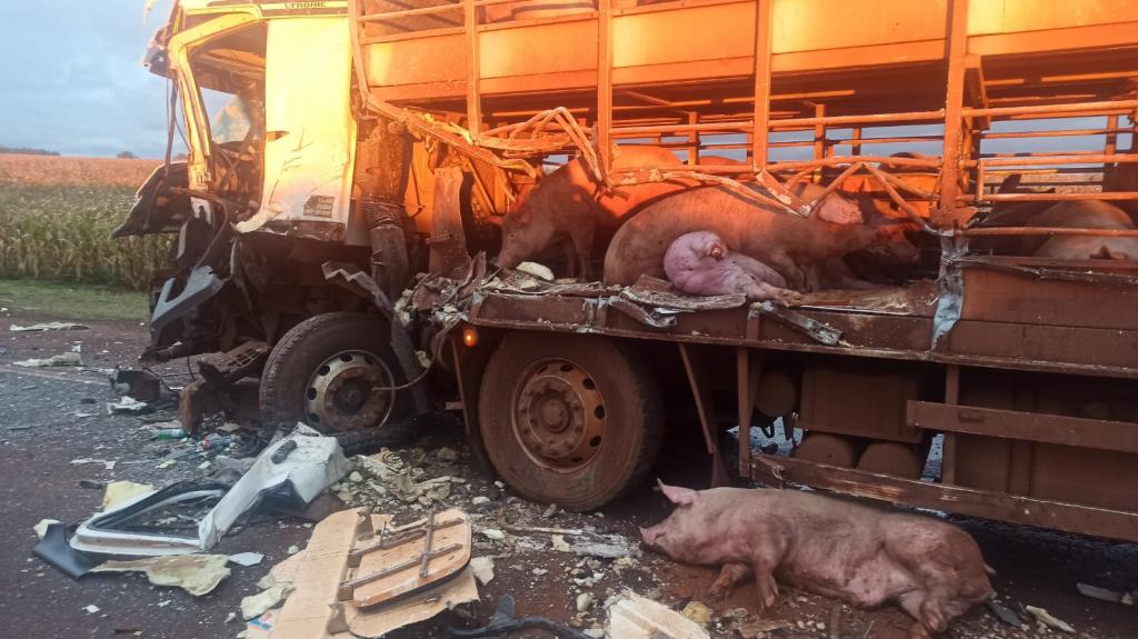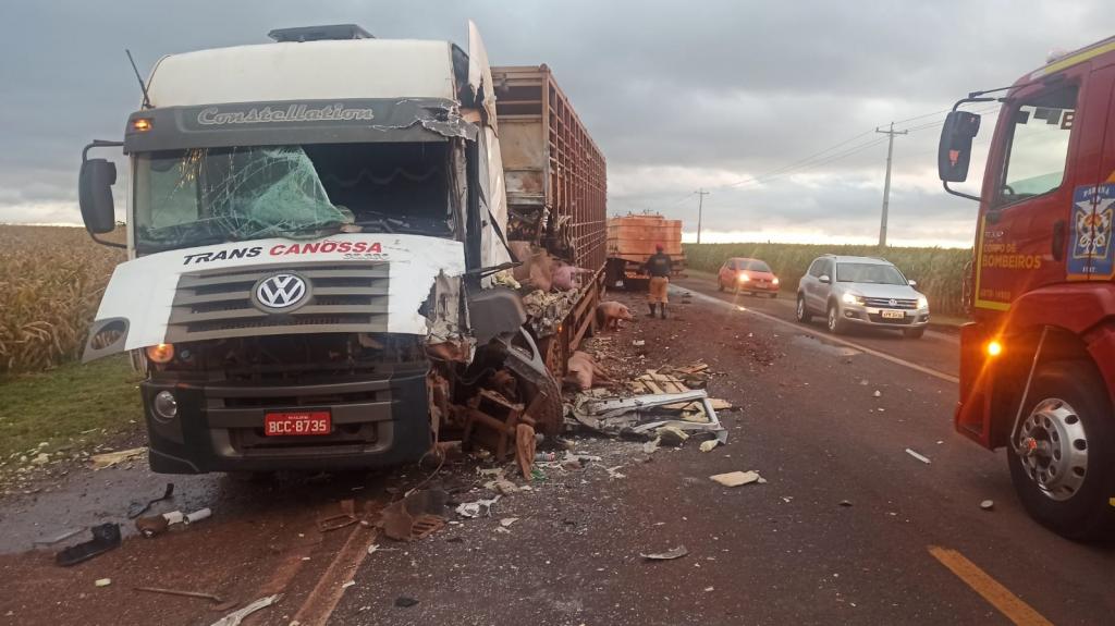 Um caminhão Volkswagen com placas de Palotina transportando suínos e um caminhão Iveco com placas do Mercosul de transportes de peixes colidiram.
