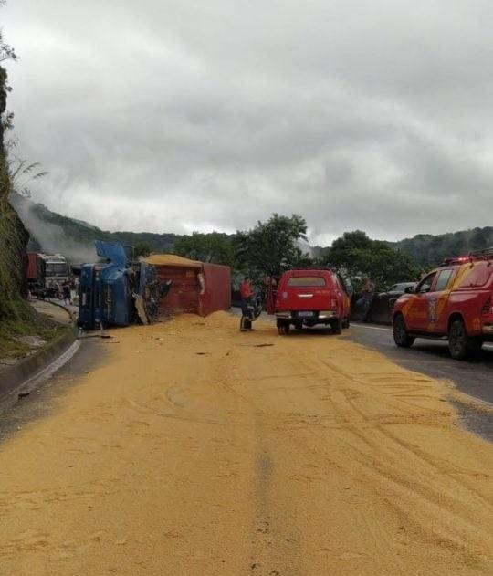 O outro veículo envolvido seria uma carreta graneleira. A carga ficou esparramada pela pista.