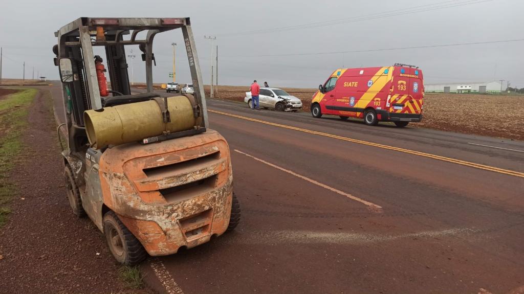 Um acidente foi registrado por volta das 8h00 desta quarta-feira na rodovia PR-239 no km 50, próximo ao trevo que dá acesso ao distrito de Ouro Preto e envolveu um veículo Volkswagen Voyage com placas da cidade de Assis Chateaubriand e uma máquina empilhadeira.
