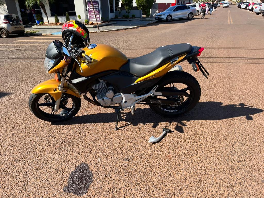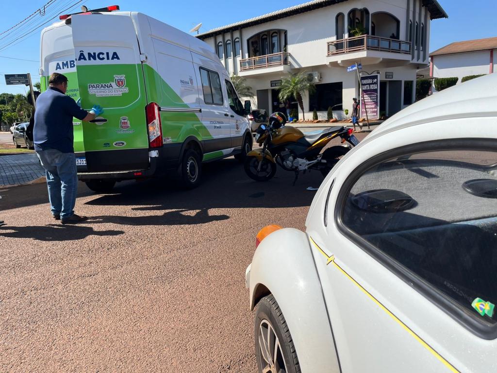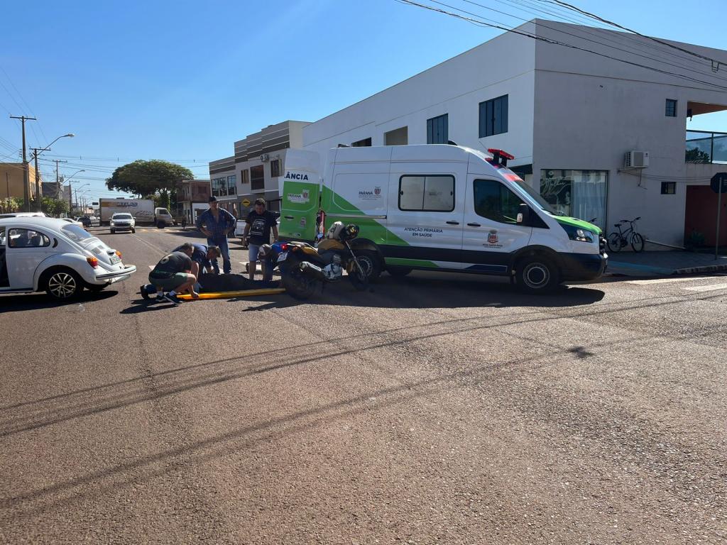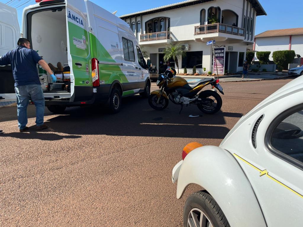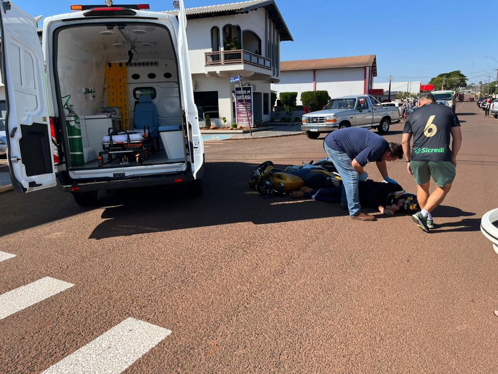 Um motociclista resultou com ferimentos após um acidente entre carro e moto na avenida Horizontina, centro de Nova Santa Rosa, esquina com a Funerária Santa Rosa a poucos minutos atrás.